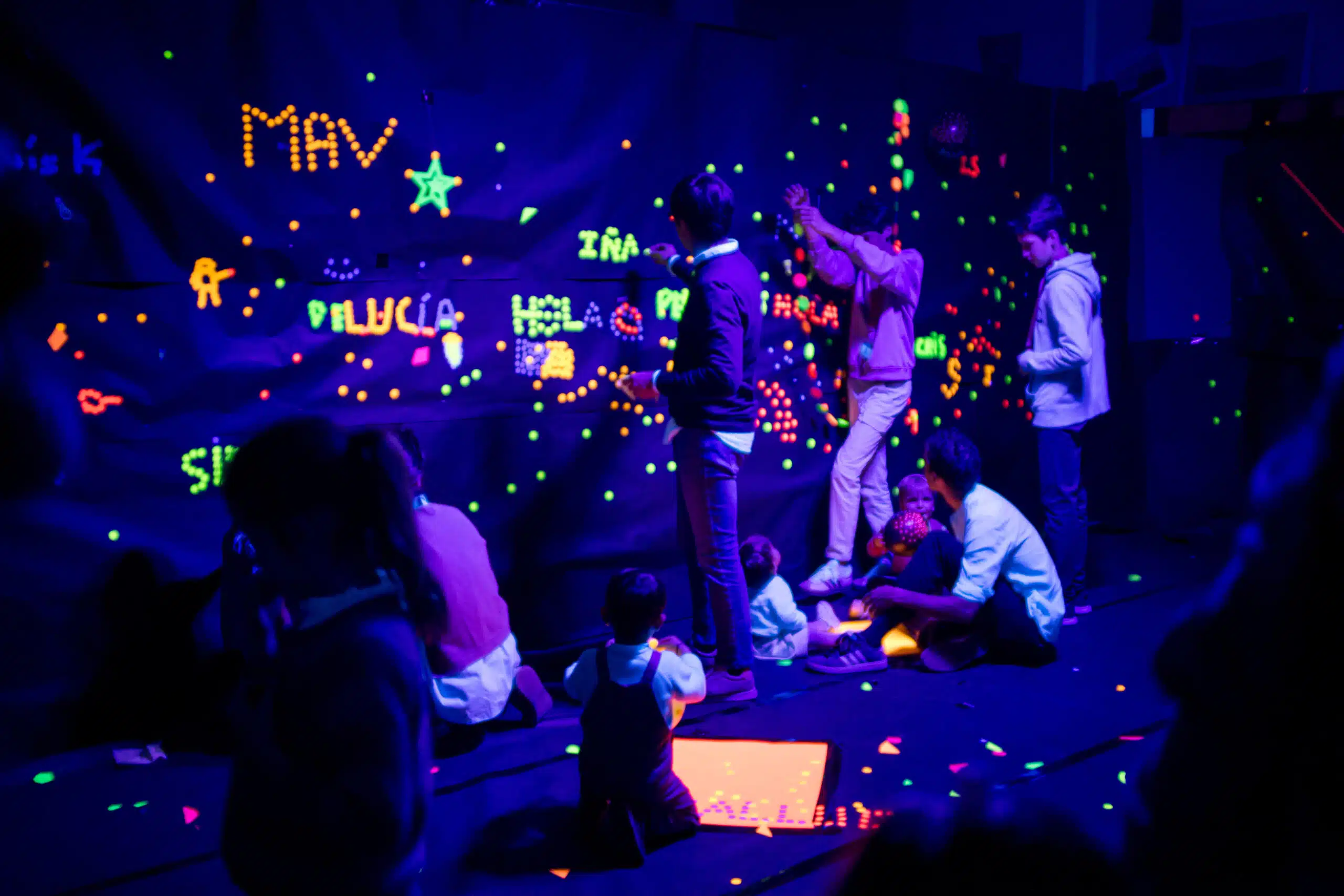 Entre els tallers artístics trobaràs l’espectacular sala de llum negra en una de les aules de Pins, on els dibuixos s’il·luminen i cobren vida.